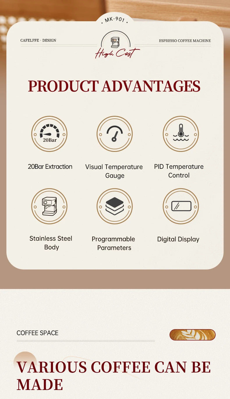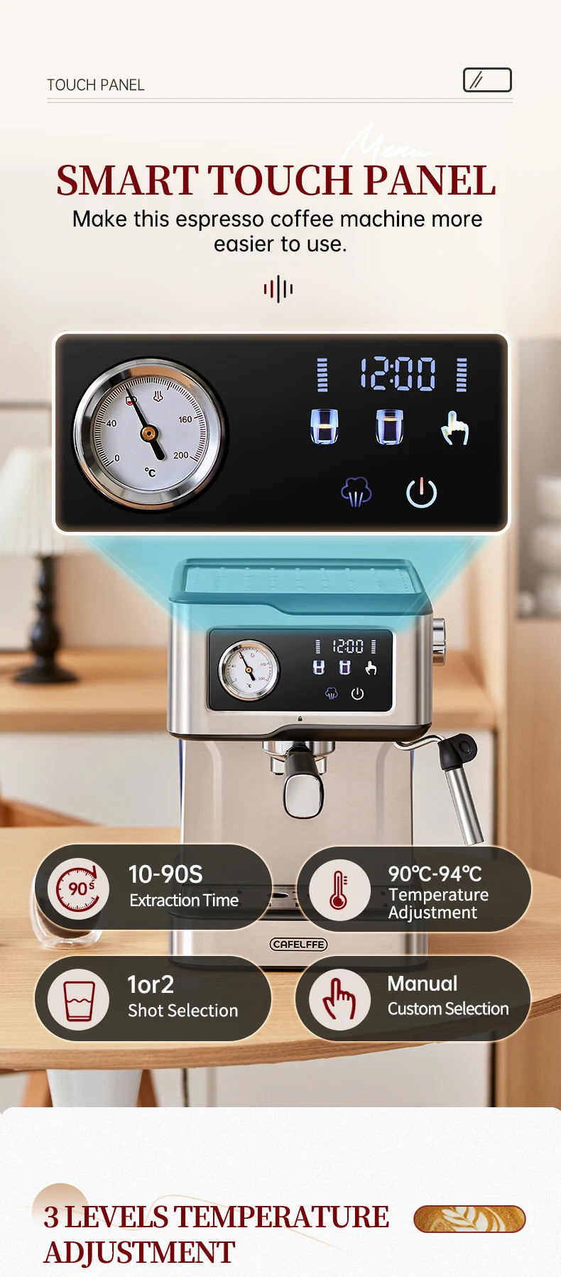 Unlock the full potential of your coffee beans with our 20 bar high-pressure extraction! Make each cup of espresso richer and more aromatic, thanks to our powerful heating system and touch control panel. Embrace the adventure of perfecting your milk frothing skills with the help of our steam wand, and find your ideal coffee temperature with three adjustable settings. Plus, our compact design and easy-to-clean features make using and maintaining this espresso machine a breeze!