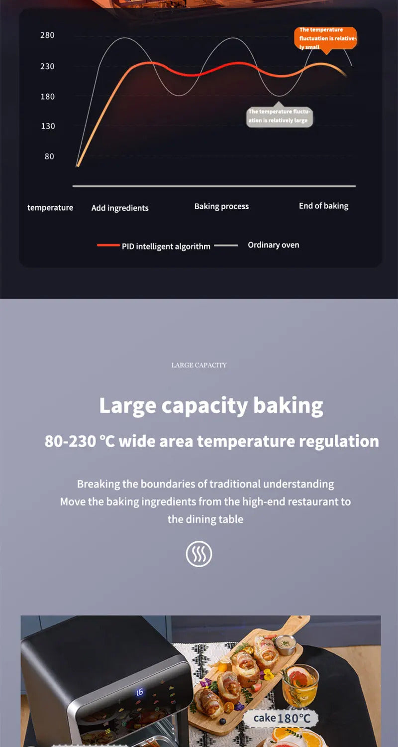 3.Multi function: integrated baking and air frying, no flipping, 360 degree circulating hot air.