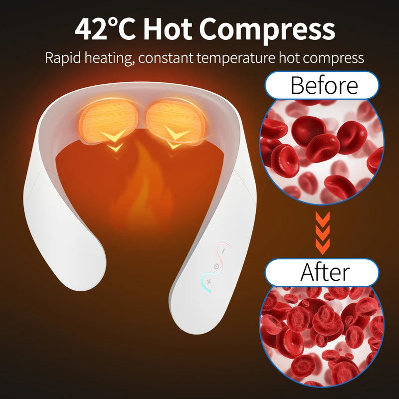2 gears constant temperature hot compress, warm penetrate the shoulder and neck skin, deeply relax the shoulder and neck muscles, relieve fatigue. Built-in heating thermostat, 5 seconds of heating, fast heating, strong heat conduction.