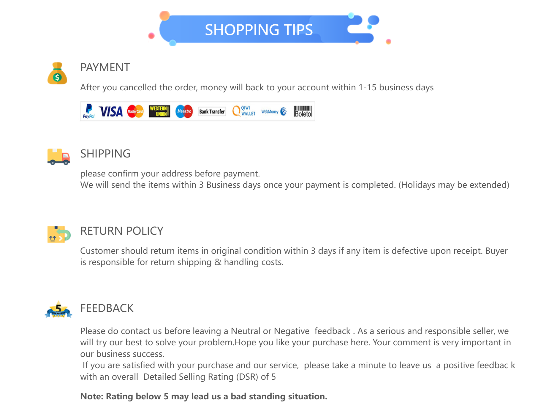 When you receive the product and find that the product has quality problems, please contact us in time, we will give you resend or refund. In order to solve the problem better, please don't open dispute.
