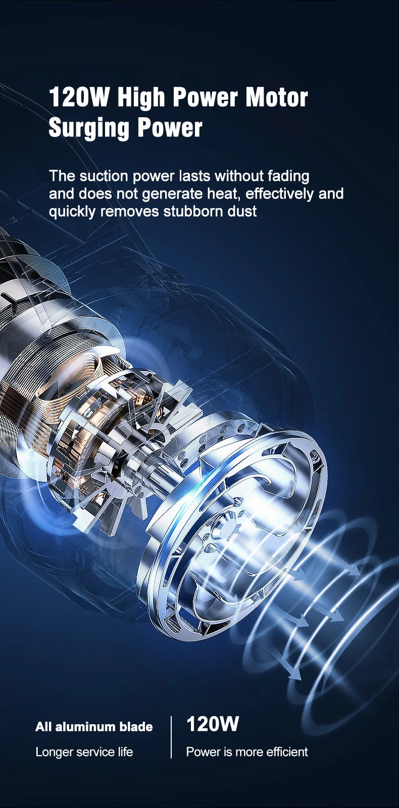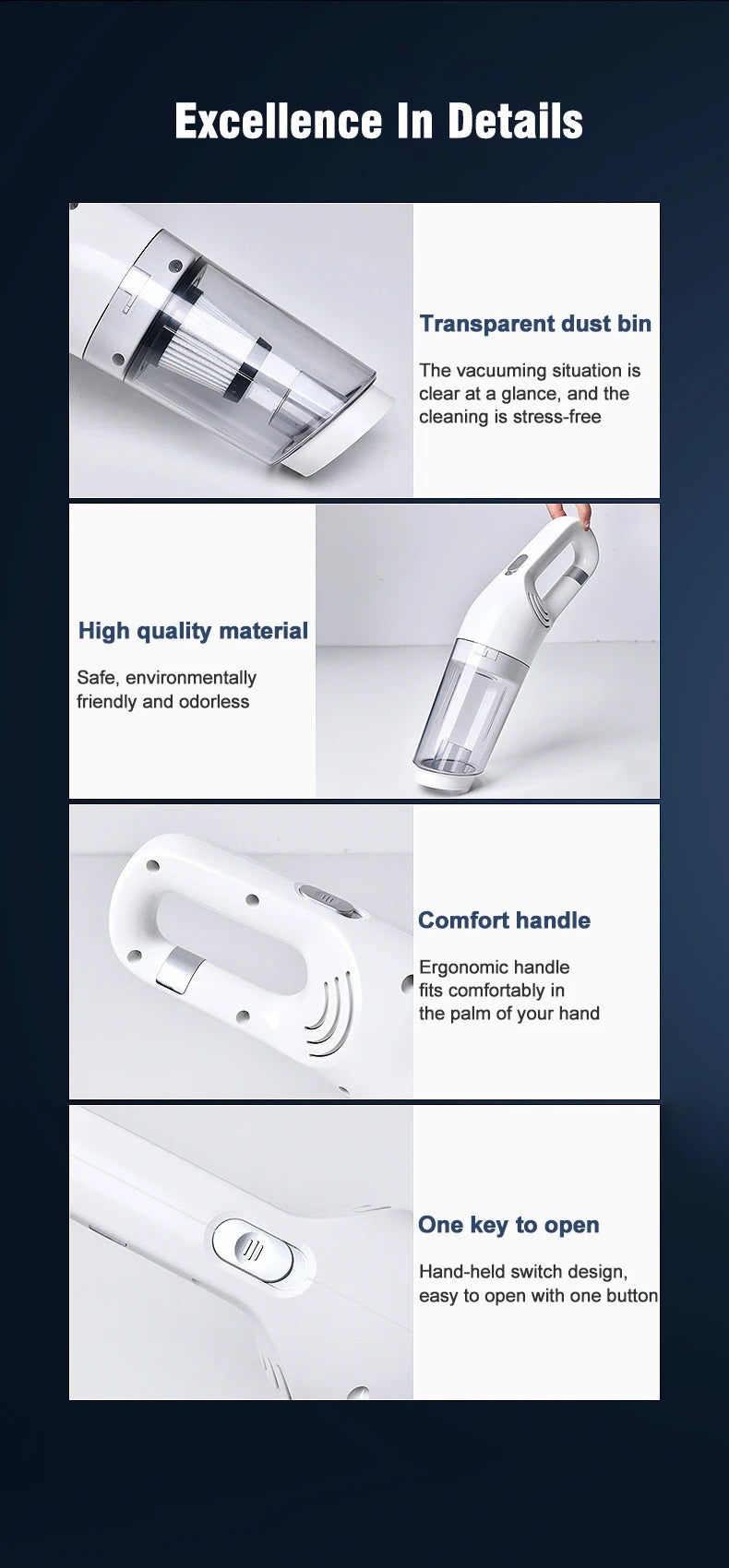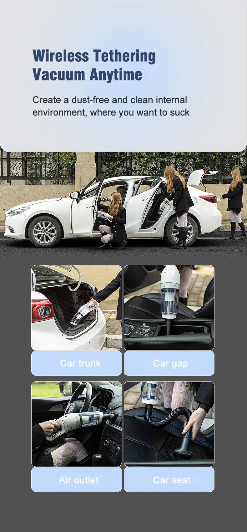 1. This wireless vacuum cleaner has a super suction power of 6500Pa, adopts quadruple high-efficiency filtration, and multiple sets of brush heads for cleaning. It is very easy for you to clean your home or the car.